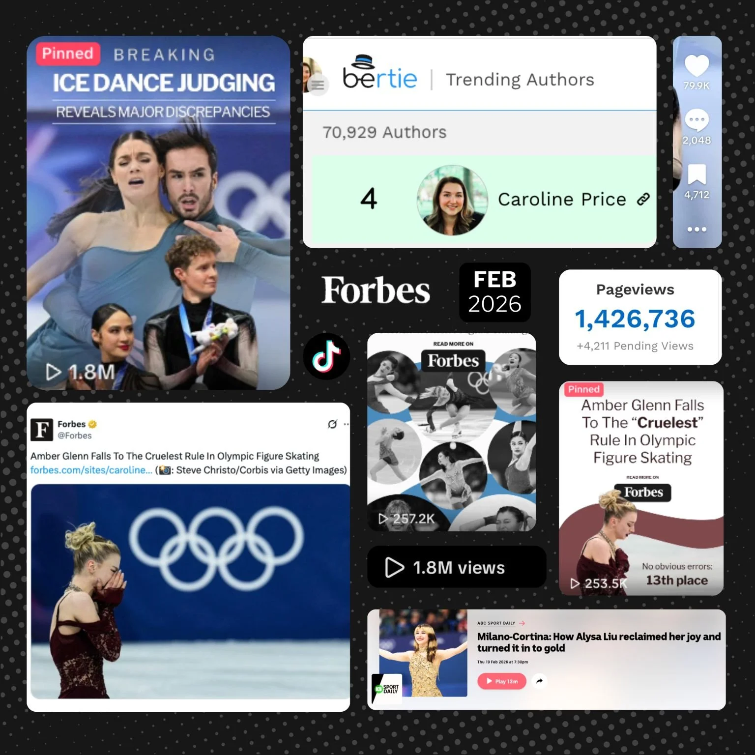 And that's a wrap on my figure skating coverage of Milano Cortina 2026! My Forbes work and my personal TikTok combined for over 5 million views during the Winter Olympics, earning a sustained ranking in the top five among 70,000+ Forbes authors. The traction led to an expert appearance on ABC Australia radio.